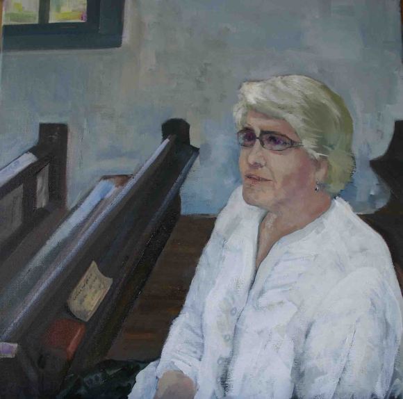 Jean is my wife. We decided to get married after we had known each other for a week in 1976. I hope this picture conveys her dignity and poise, and the significance of her being “interested” whilst sitting in our small local church talking to Mary ( Churchwarden). For me, just painting a person is never going to be enough. I want to paint the person “being the person.