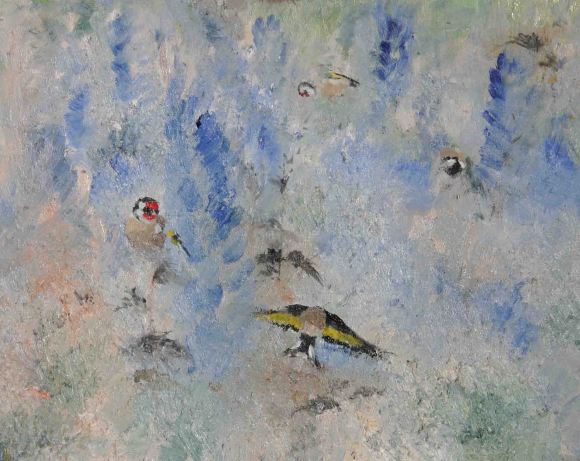 In the quest to get to grips with how important abstraction is to true expressiveness in my art, I experimented with a painting based on some sketchbook images I made of goldfinches feeding on thistles in my garden on a bright windy Autumn day. In the process, I think I have started to really understand just how brilliantly innovative JMW Turner really was. Not that I am setting myself up as a rival you understand. I have called it “the Charm” after the Victorian collective noun for these birds.
