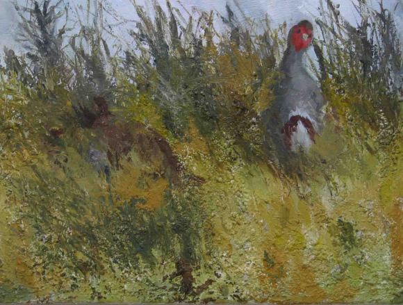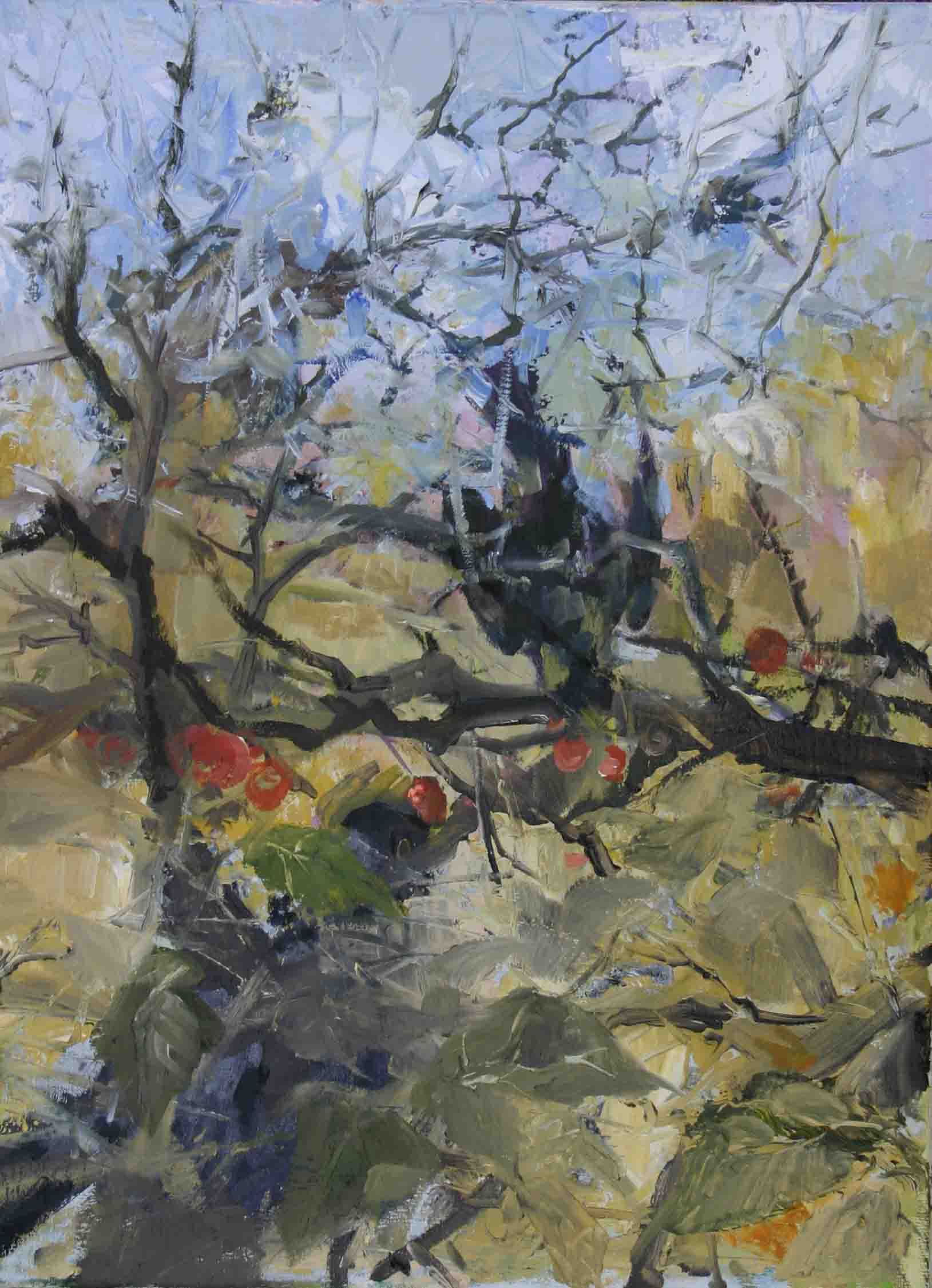 So this week I took up an old painting idea based on blackbirds feasitng in a crab apple tree, to try to express the frenzy, and the atomosphere of a windy, and sunny autumn day.
